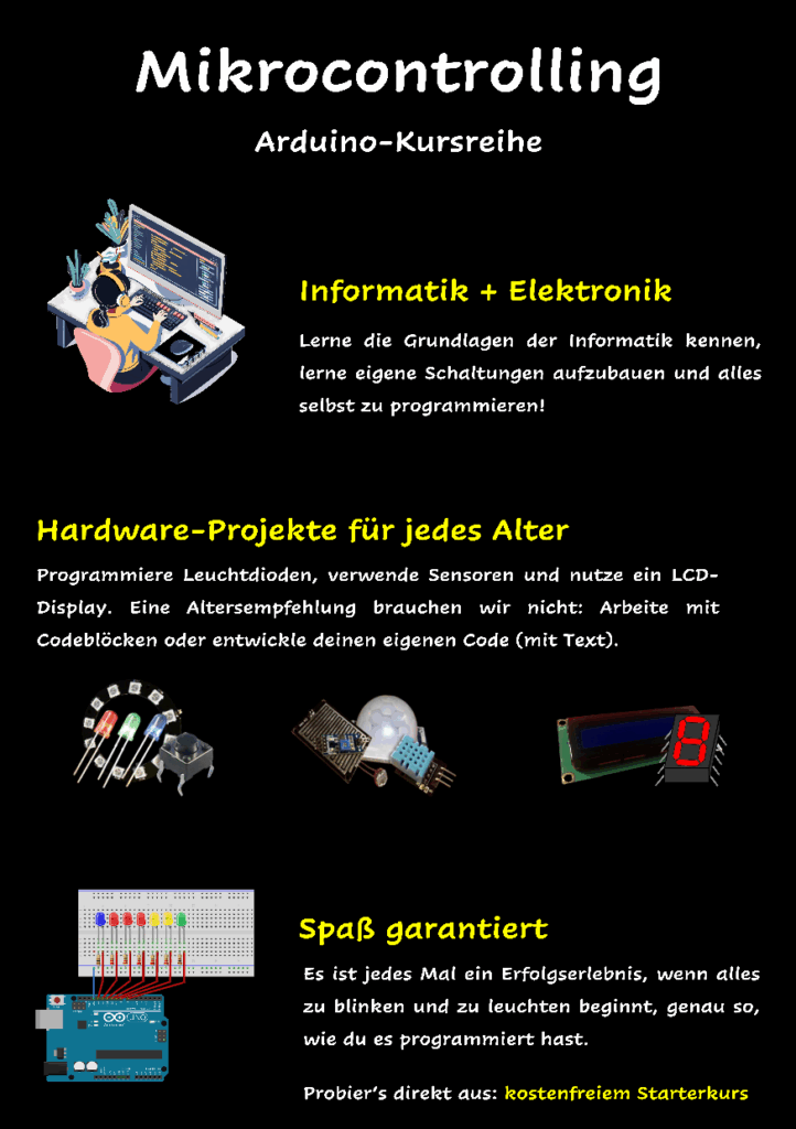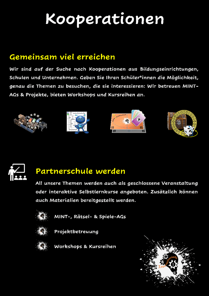 Gemeinsam viel erreichen: Wir bieten Live-Kurse an, begleiten MINT-AGs, Projektwochen, Workshops/Kursreihen während und nach den Schulzeiten, betreuen interaktive Mitmachstationen vor Ort du auf Events, stellen Materialien sowie interaktive Selbstlernangebote bereitstellen.