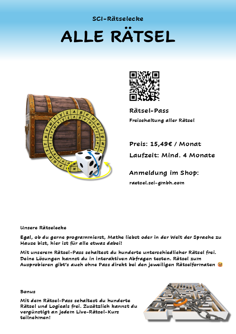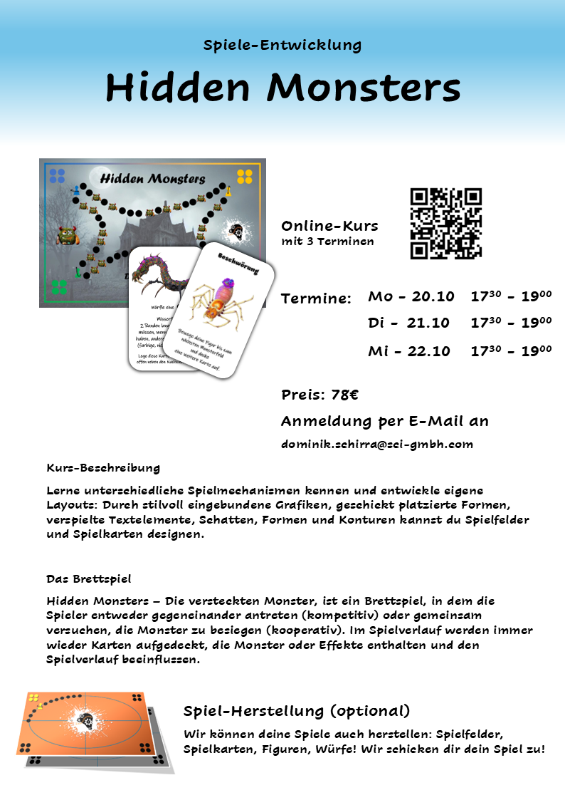 Bei uns heißt es Tüfteln, Knobeln und Entdecken: In der SCI Ideenschmiede lernst du spielerisch Programmieren, erforschst die Welt des Mikrocontrollings, entwickelst Brett- und Kartenspiele, stellst dich den Herausforderungen der Rätselecke oder kreierst eigene Websites und Animationen.